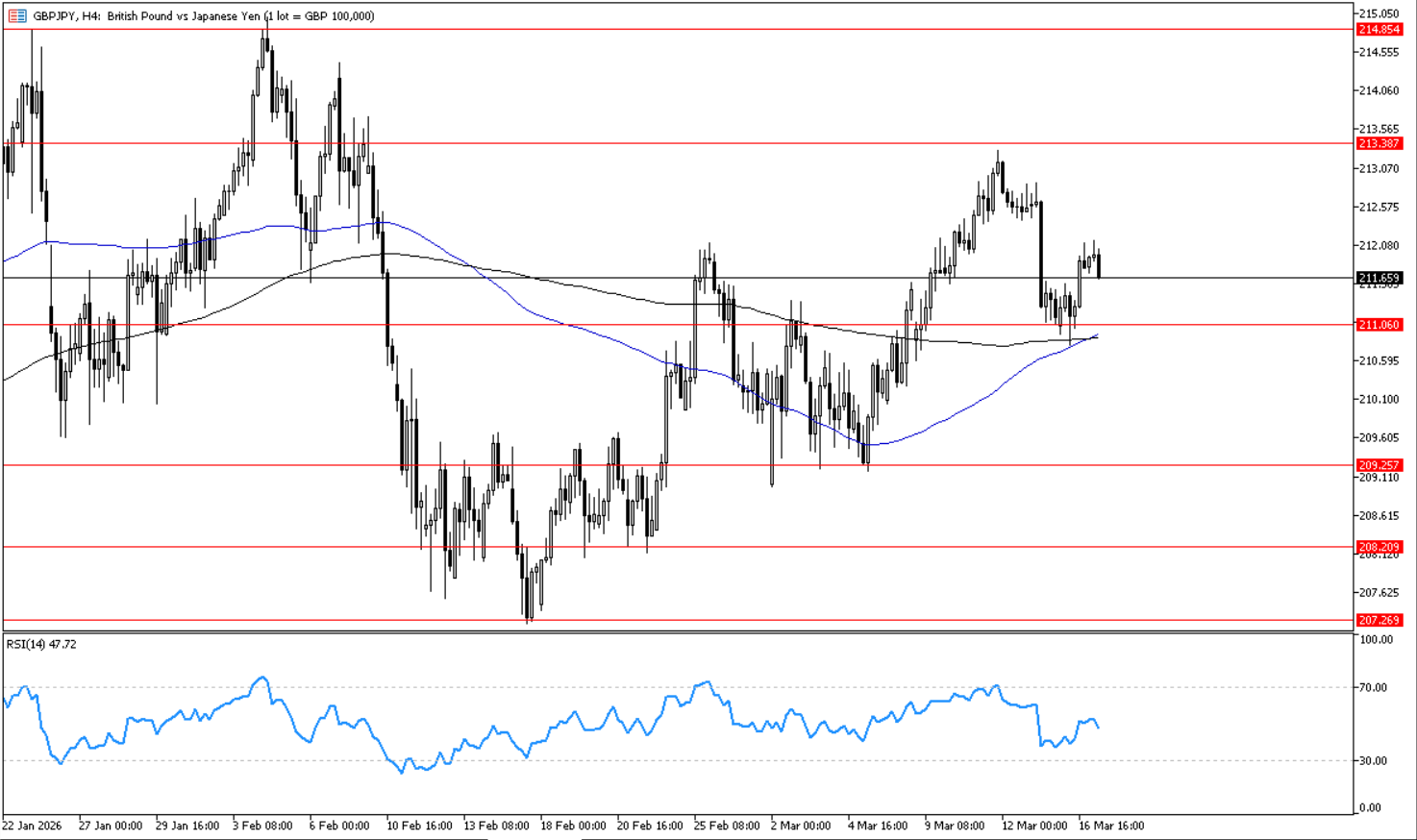 يتحرك الزوج في اتجاه صاعد على اطار الأربع ساعات, وارتد لاعلي حول مستوى 211.05 الذي يمثل مستوى دعم افقي على اطار الاربع ساعات, ما يدعم استمرار الاتجاه الصاعد واستهداف مستوى 213.40 ثم 214.95. ويظهر مؤشر القوة النسبية احتمالات استمرار الاتجاه الصاعد بتحركه اعلي مستوى 40 .