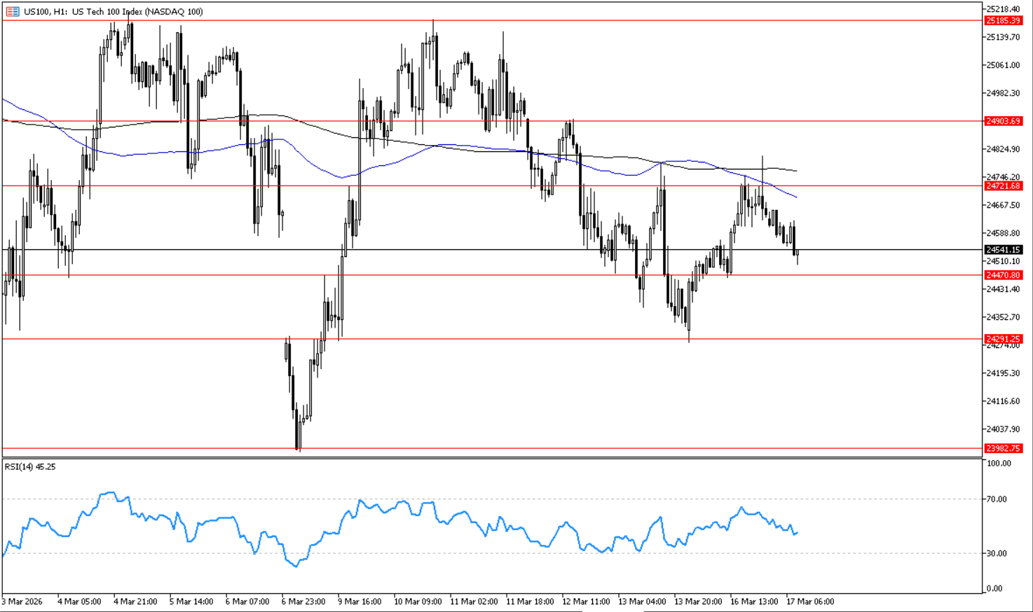 يتحرك المؤشر في اتجاه هابط على اطار الساعه, ويتداول حول مستوى 24470 الذي يمثل مستوى دعم افقي على اطار الساعه, وبكسره يدعم استمرار الاتجاه الهابط واستهداف مستوى 24300 ثم 23980. ويظهر مؤشر القوة النسبية احتمالات استمرار الاتجاه الهابط بتحركه اسفل مستوي 50.